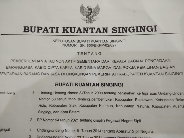 Diduga Dipicu Persoalan Tender Proyek, Pejabat di PUPR Pemkab Kuansing Dicopot Plt Bupati