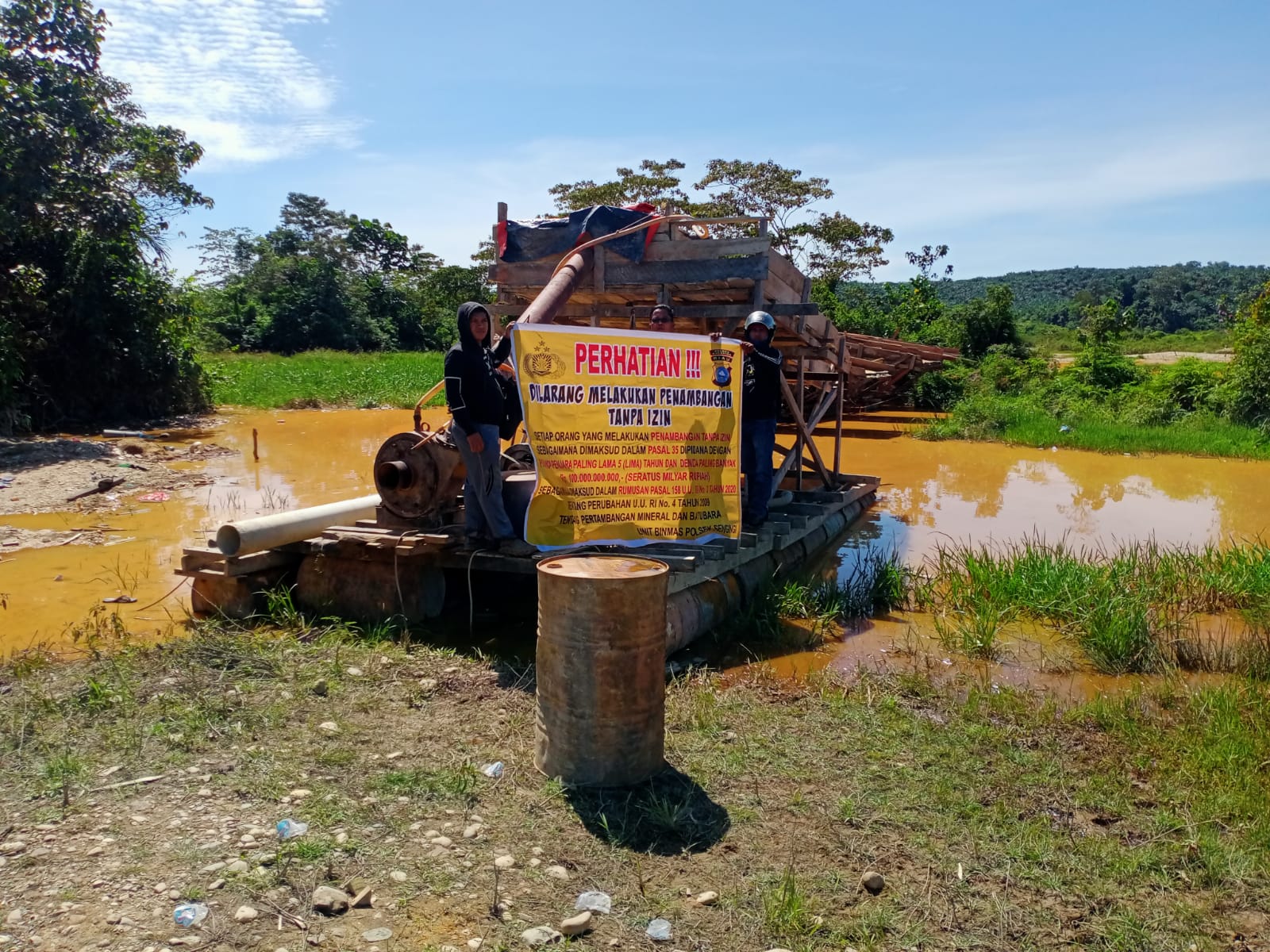 Mediasindonews.com | KUANTAN SINGINGI - Kapolsek Singingi AKP Koko Ferdinan Sinuraya, SH, MH yang diwakili Kanit Samapta Iptu Syafrizal Kembali terjun menyisir Aktifitas Penambang Emas Tanpa Ijin (PETI) dan menemukan 11 (sebelas) Rakit PETI yang sedang tidak beroperasi, Jumat (3/6/2022) sekira pukul 10.00 WIB di Kelurahan Muara Lembu Kecamatan Singingi Kabupaten Kuansing Riau."Terhadap 11 (sebelas) rakit PETI itu, dilakukan langkah dengan mengambil barang bukti dan memasang spanduk