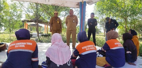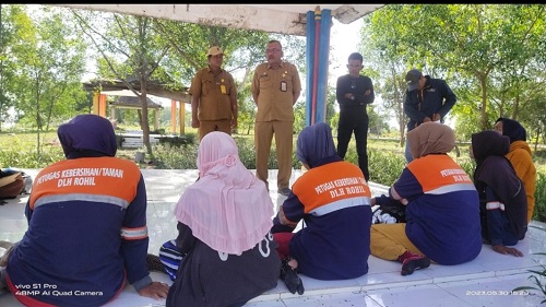 ROHIL - Kepala Dinas Lingkungan Hidup Kabupaten Rokan Hilir Suwandi SSos melakukan kunjungan kerja Kepada Petugas Kebersihan dan Taman yang tersebar diberbagai lokasi Jalan Lintas perkantoran Pesisir Sungai Rokan, Selasa (30/5/2023) Sore.