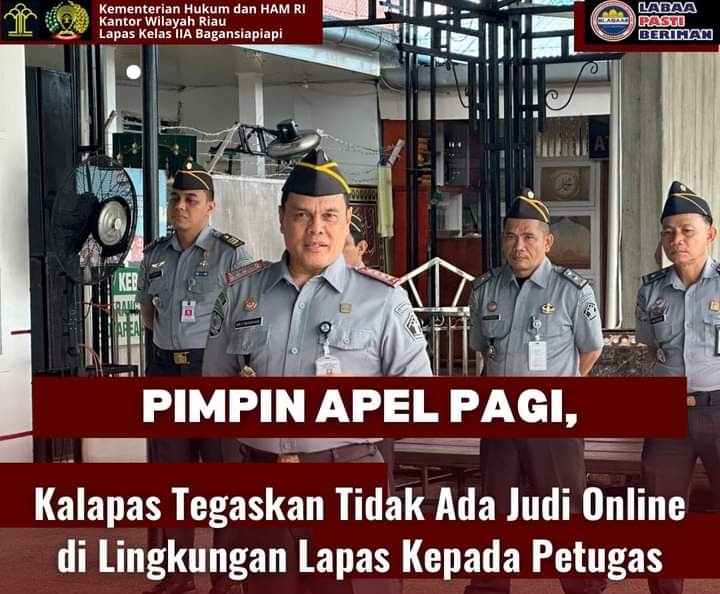 Mediasindonews.com | Rokan Hilir - Kepala Lembaga Pemasyarakatan (Lapas) Kelas IIA Bagansiapiapi, Ika Prihadi Nusantara tegaskan larangan keterlibatan Judi Online bagi jajaran Pegawai Lapas kelas II Bagansiapiapi, pada pelaksanaan Apel Pagi Pegawai, Selasa (2/7/2024)