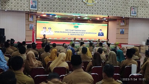 Mediasindonews.com | Rohil - Bupati Rokan Hilir (Rohil) Afrizal Sintong memimpin rapat Pejabat Pemerintah Daerah Tentang Percepatan Penyelesaian Batas Kelurahan dan Kepenghuluan se-Kabupaten Rokan Hilir, Senin (24/7/2023) di gedung Misran Rais Bagansiapiapi.Rapat tersebut dihadiri Wakil Bupati, Sekda, seluruh camat, penghulu dan lurah, kepala dinas, serta Forkompinda. Dalam arahannya, Bupati Rohil mengungkapkan, saat ini baru ada sekitar 35 kepenghuluan di Rohil yang selesai masalah tapal batas