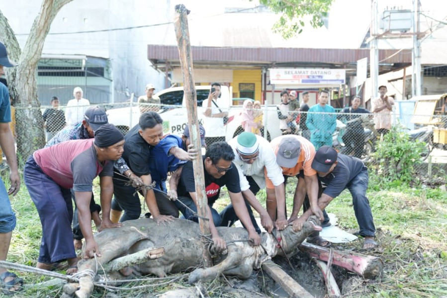 Rohil - Pada momen perayaan Idul Adha 1444 Hijriyah tahun 2023, Bupati Rokan Hilir (Rohil) Afrizal Sintong SIP bagikan ratusan paket Sembako yang diperuntukan bagi masyarakat Bagansiapiapi yang berprofesi sebagai tukang becak, gerobak dan wartawan, Kamis (29/6/2023).Penyerahan paket sembako yang dipusatkan di Gedung Misran Rais tersebut secara langsung dilakukan Bupati didampingi ketua PKK Sanimar Afrizal, Sekda Rohil H Fauzi Efrizal, Basznas dan beberapa kepala OPD."Alhamdulillah hari ini