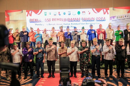 Dumai - Guna mengantisipasi potensi kerawanan menjelang tahapan inti pada Pemilihan Umum (Pemilu) Tahun 2024 mendatang, Polda Riau menggelar kegiatan Deklarasi Pemilu Damai Tahun 2024, Senin (28/8/2023).Wali Kota Dumai, H. Paisal SKM, MARS tampak hadir dalam acara yang dilangsungkan di Grand Ballroom SKA Co-Ex Pekanbaru. Deklarasi Pemilu Damai yang mengusung tema “Pemilu yang Aman, Damai, Kondusif, dan Berintegritas” di Provinsi Riau ini turut dihadiri Gubernur Riau, Kapolda