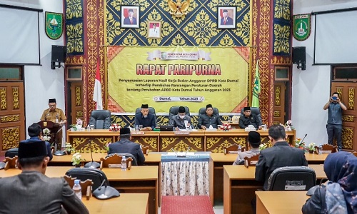 Dumai - Dihadapan 21 orang Anggota DPRD Kota Dumai, Wali Kota Dumai bacakan sambutan sekaligus ucapan terima kasih atas kerjasama DPRD Kota Dumai dalam alur pengesahan Rancangan Peraturan Daerah Tentang Perubahan APBD Kota Dumai Tahun 2023 berlokasi di Ruang Rapat Paripurna DPRD Kota Dumai, Senin (28/8/2023).Rapat dipimpin oleh Ketua DPRD Kota Dumai Suprianto,SH. Pada kesempatan ini, Ketua DPRD Kota Dumai turut membacakan beberapa rangkaian alur menuju pengesahan Rancangan Peraturan Daerah