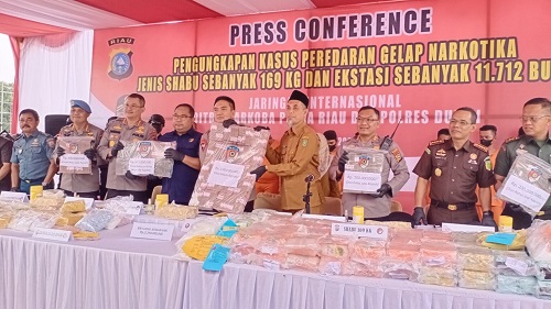 DUMAI — Kapolda Riau, Irjen Pol Muhammad Iqbal memimpin ekspose pengungkapan kasus peredaran gelap Narkotika Jenis Sabu sebanyak 169 kg dan Esktasi sebanyak 11.712 butir Jaringan Internasional oleh Ditresnarkoba Polda Riau, dan Polres Dumai.
