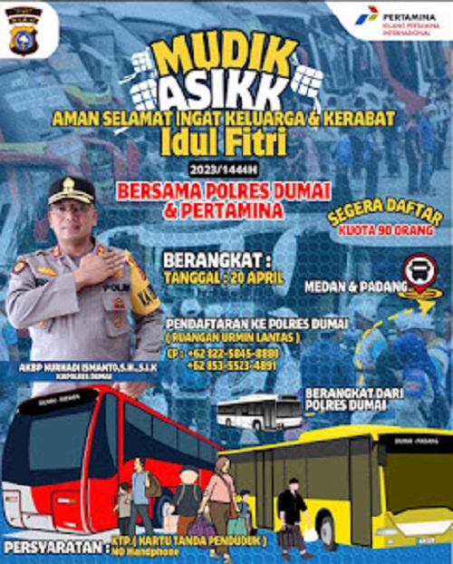 Mediasindonews.com, DUMAI - Polres Dumai meluncurkan program mudik gratis yang disponsori oleh Pertamina. Program yang diberi tajuk ‘Mudik Asikk, Mudik Aman Selamat Ingat Keluarga dan Kerabat’ ini dikhususkan untuk warga Kota Dumai yang ingin pulang kekampung halamannya dimomen Hari Raya Idul Fitri 1444H/2023M untuk tujuan Kota Medan dan Kota Padang.Kapolres Dumai AKBP Nurhadi Ismanto, S.H, S.I.K menyampaikan, kepada seluruh masyarakat Kota Dumai yang ingin mudik dengan tujuan
