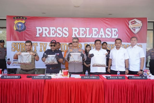 Mediasindonews.com | Pekanbaru - Penyelundupan 41 kilogram sisik trenggiling dari Padang Sidempuan, Sumatera Utara berhasil di gagalkan Subdit IV Tipidter Direktorat Kriminal Khusus (Ditkrimsus) Polda Riau, Hal ini terungkap dalam Press release yg di lakukan Polda Riau Pada Senin (25/9/23). di Halaman Belakang Mapolda Riau.Seorang Tersangka pemilik Sisik trenggiling tersebut telah diamankan berinisial MS (54) di jalan Paus Ujung Kelurahan Tangkerang Barat Kec. Marpoyan damai
