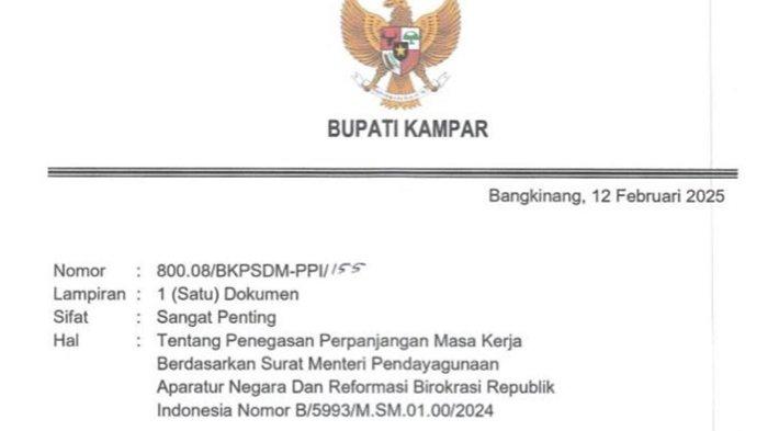 Mediasindonews.com I Kampar - Penjabat (Pj) Bupati Kampar, Hambali akhirnya mengeluarkan surat penegasan masa kerja tenaga honorer. Termasuk kategori yang masa kerjanya disetop. Surat bernomor 800.08/BKPSDM-PPI/155 tertanggal 12 Februari 2025. Surat bersifat sangat penting itu mengacu kepada Surat Menteri Pendayagunaan Aparatur Negera dan Reformasi Birokrasi (MenPANRB) Nomor B/5993/M.SM.01.00/2024. Kepala Badan Kepegawaian dan Pengembangan Sumber Daya Manusia (BKPSDM) Kampar, Syarifuddin