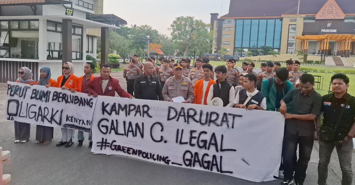 Padahal, Kepolisian belakangan gencar mempromosikan jargon Green Policing. Namun di lapangan, kesan yang muncul justru sebaliknya, Kapolres dan Kapolsek seolah menutup mata dan telinga. Membiarkan alat berat, keong penyedot pasir, hingga puluhan mobil dump truck keluar masuk wilayah tambang tanpa hambatan. “Apa gunanya ada Kapolres dan Kapolsek jika tambang ilegal bisa beroperasi bebas di depan mata? Apakah aparat setempat benar-benar tidak tahu?” tanya Risky Ahmad Fauzi, salah satu koordinator aksi, menyindir keras peran aparat di Kampar.