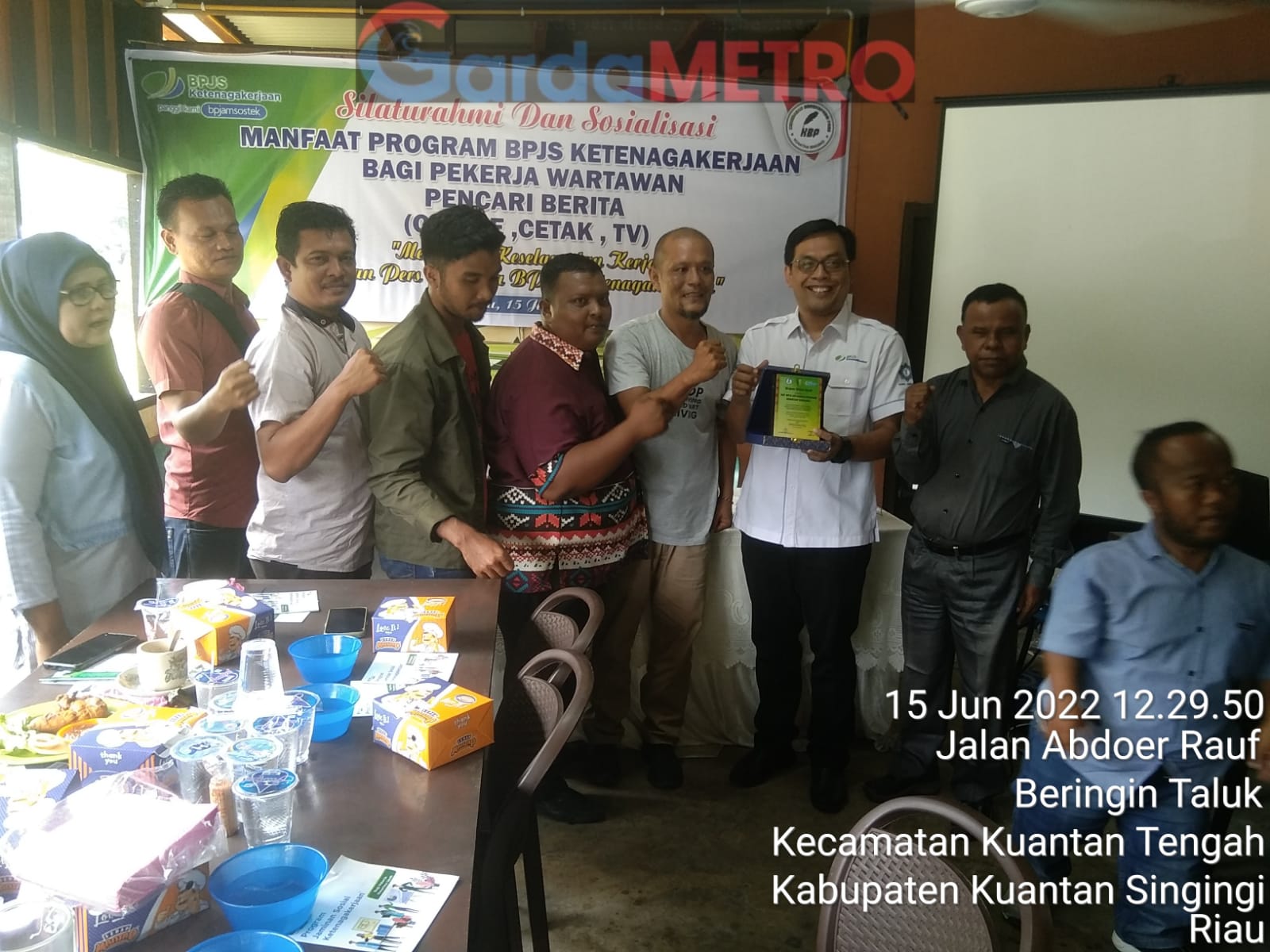 Mediasindonews.com Tekuk Kuantan - Silaturrahmi dan Sosialisasi manfaat program BPJS ketenagakerjaan bagi pekerja Wartawan pencari berita, baik media online, media cetak, maupun Televisi, untuk menjamin perlindungan sosial ketenagakerjaan Insan Pers Kuantan Singingi, pada Rabu, (15/6/2022) pukul: 10 .00 Wib di Lesehan Naniki, Sungai Lintang, kecamatan Sentajo Raya. Kuansing.Hadir dalam Silahturami dan Sosialisasi itu, Kepala Kantor BPJS ketenagakerjaan Kuansing, Diyan Handiyana, Staf