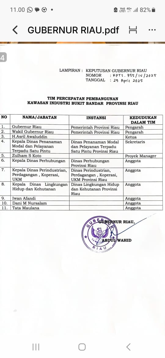 Kali ini, Berdasarkan Surat Keputusan (SK) Nomor KPTS.355/IV/2025, tanggal 29 April 2025 tentang Tim Percepatan Pembangunan Kawasan Industri Bukit Bandar Provinsi Riau.