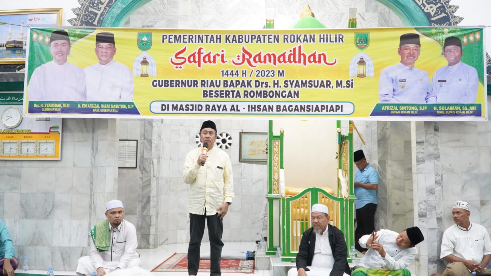 mediasindonews.com, Rohil - Wakil Bupati Rokan Hilir (Rohil) H Sulaiman SS MH dampingi Gubernur Riau Drs H Syamsuar laksanakan safari ramadhan 1444 H di Masjid Raya Al Ikhsan Bagansiapiapi, Kamis (30/3/2023) malam.Safari ramadhan Gubernur Riau H Syamsuar dan rombongan di di Masjid raya Al-ikhsan tersebut dihadiri para Kepala OPD di lingkungan pemkab Rohil dan berbagai unsur lainnya serta masyarakat Bagansiapiapi.Wakil Bupati Rohil H Sulaiman dalam sambutannya menyampaikan ucapkan terimakasih