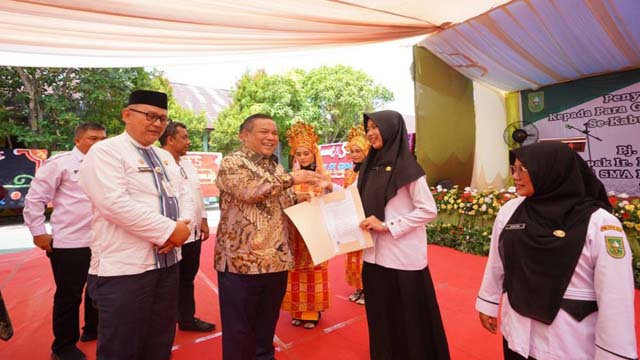 Mediasindonews.com I Rokan Hilir - Sebanyak 173 Surat Keputusan (SK) Pegawai Pemerintah dengan Perjanjian Kerja (PPPK), diserahkan kepada tenaga pendidik SMA/SMK/SLB dilingkup Pemerintah Provinsi (Pemprov) Riau yang berada di Kabupaten Rokan Hilir, Riau.