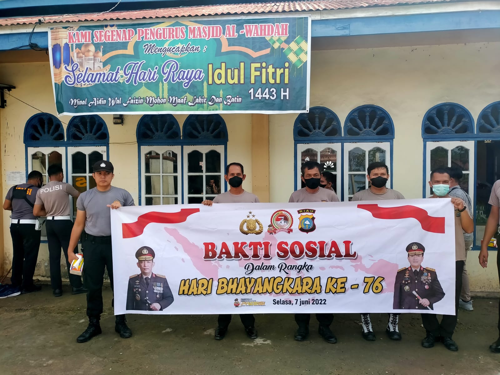 Mediasindonews.com | ROKAN HULU - Jelang HUT Bhayangkara 76, Personil Polres Rokan Hulu (Rohul) melaksanakan kegiatan Bakti Sosial (Baksos) religius membersihkan serta memberikan bahan bangunan Masjid Al wahdah Sei Deras Desa Suka Maju Kecamatan Rambah, Kamis (9/6/2022).Kegiatan tersebut, dihadiri Kasi was Polres Rohul AKP Tedi Sinaga, Kanit Regident Sat Lantas Rohul IPTU Efendi Lupino, SH, KBO Sat Lantas, IPDA Nof Lasri Nosa, SH, Kasubsi Si Humas AIPDA Mardiono P SH, Personil