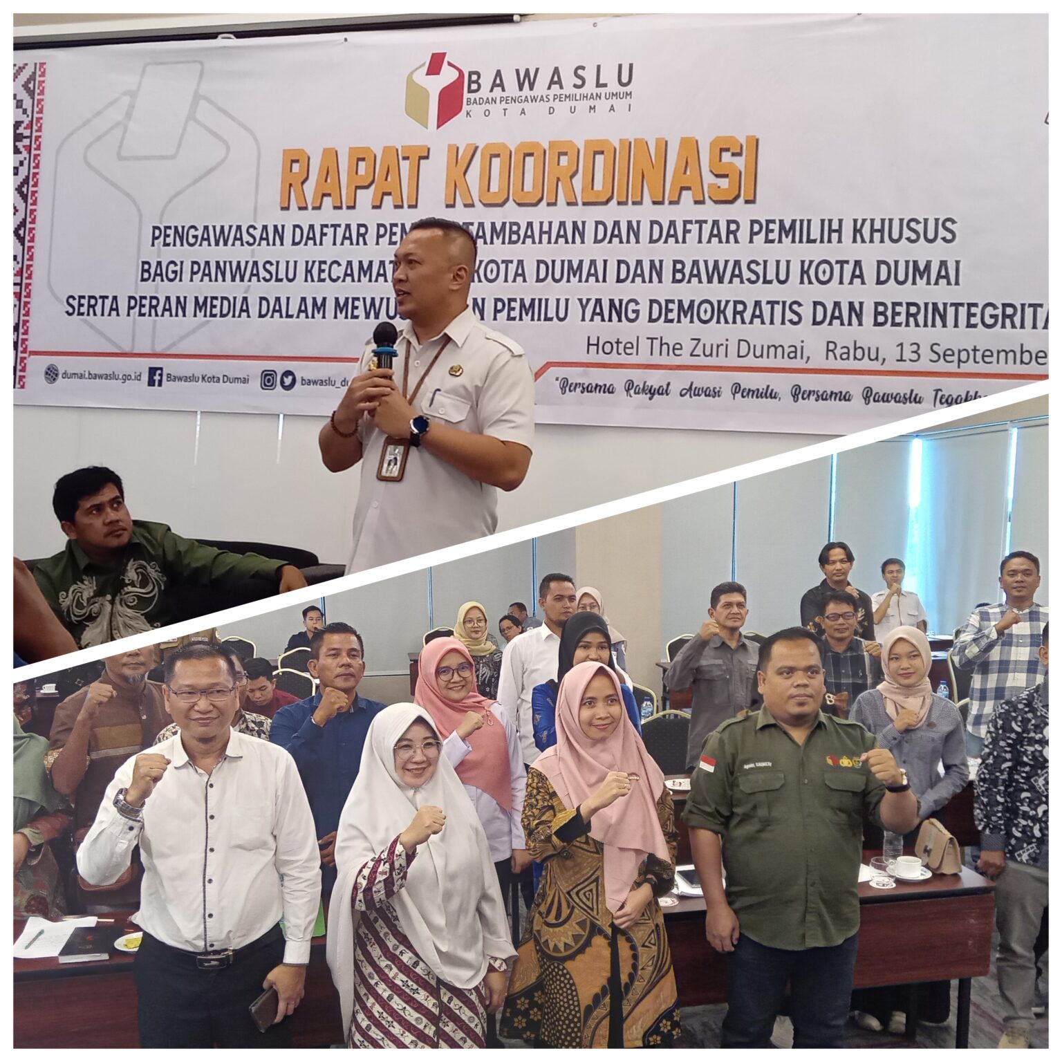 Mediasindonews.com | Dumai - Badan Pengawas Pemilu (BAWASLU) Kota Dumai mengadakan Rapat Koordinasi Pengawasan Daftar Pemilih Tambahan (DPtB) dan Daftar Pemilih Khusus (DPK) Bagi Panwaslu Kecamatan se–Kota Dumai, Rabu [13/09/2023] pukul 08.30 s/d 17.00 WIB, bertempat di Meeting Room The Zury Hotel di Kota DumaiSebagaimana diketahui bersama bahwa Komisi Pemilihan Umum (KPU)Kota Dumai JUNI lalu secara resmi telah menetapkan Daftar Pemilih Tetap (DPT) Pemilu 2024 sebanyak 231.485 orang namun