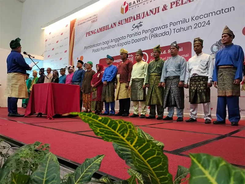 Mediasindonews.com | Dumai - Badan Pengawas Pemilu (Bawaslu) Dumai melantik anggota Panwascam untuk tujuh kecamatan di Kota Dumai, Sabtu (25/5/2024) . Di sisi lainnya, anggota Panwascam Dumai yang dilantik sebanyak 21 orang tersebut semuanya mengenakan pakaian adat di daerahnya masing-masing.